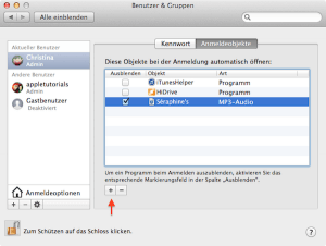 Anschließend wählen Sie Ihren Benutzer aus, gehen auf die Anmeldeobjekte und fügen einen Song aus iTunes zu Ihren Startobjekten hinzu. Fertig.